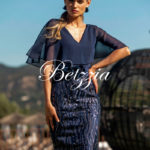 Vestido recto con falda de lentejuelas y cuerpo con mangas en capa. Incluye cinturón.