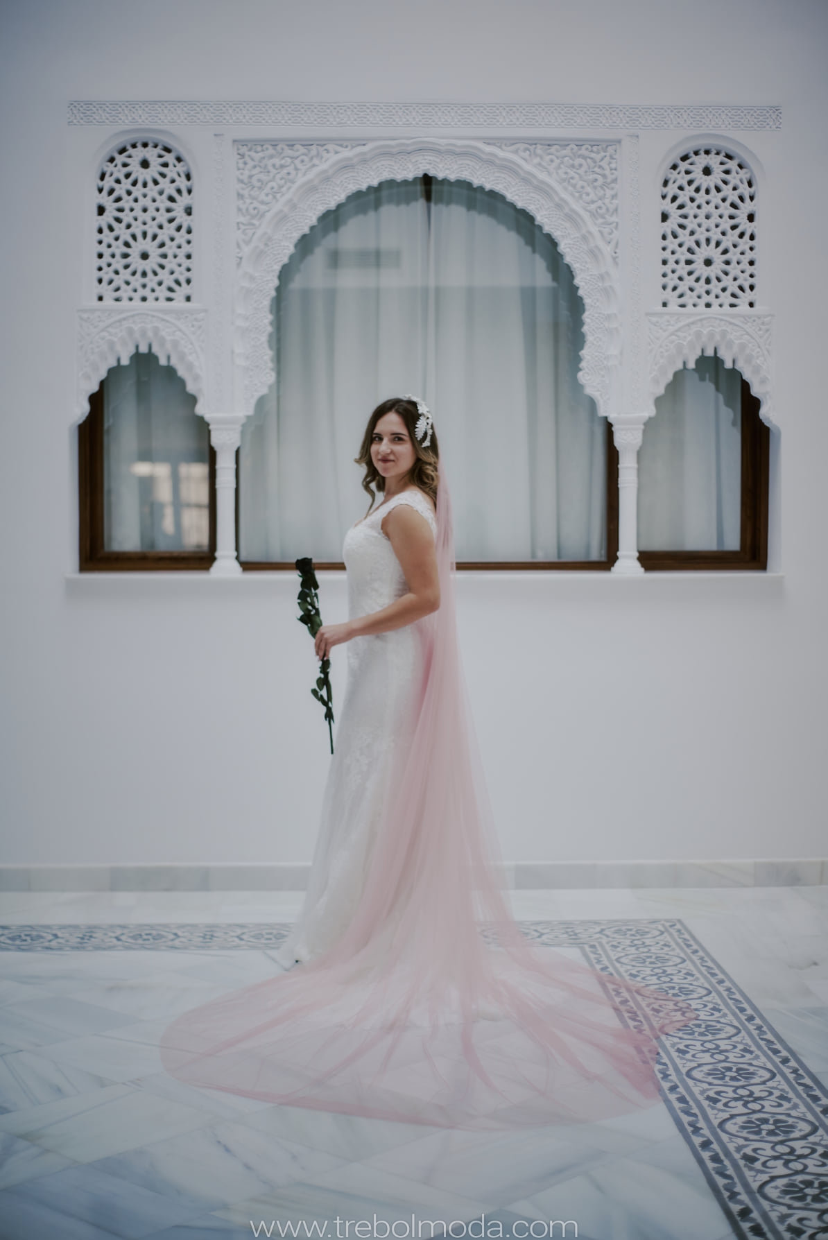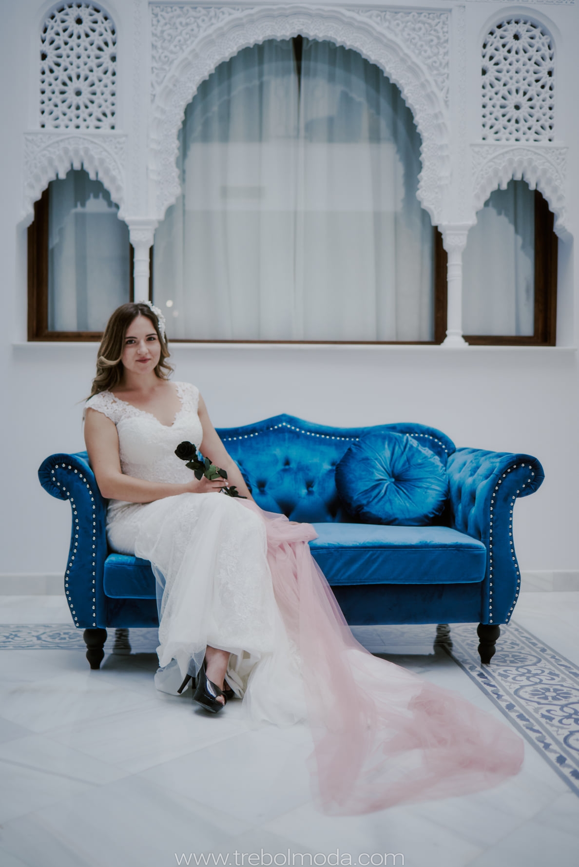 Ahora más que nunca los colores toman el protagonismo. Un velo en tono empolvado hará que luzcas radiante. Súmale unos stilletos de charol negros y como broche final una rosa negra preservada. Obtendrás como resultado un outfit nupcial evocador de efecto ¡Wow!.