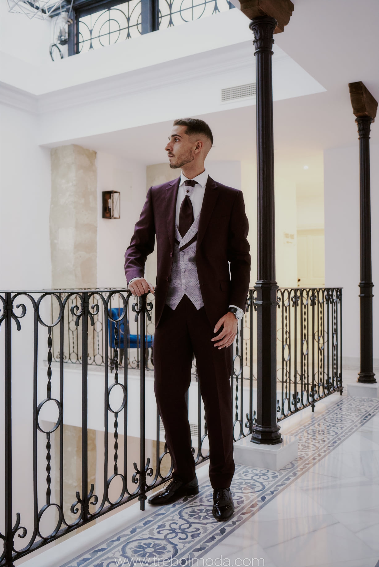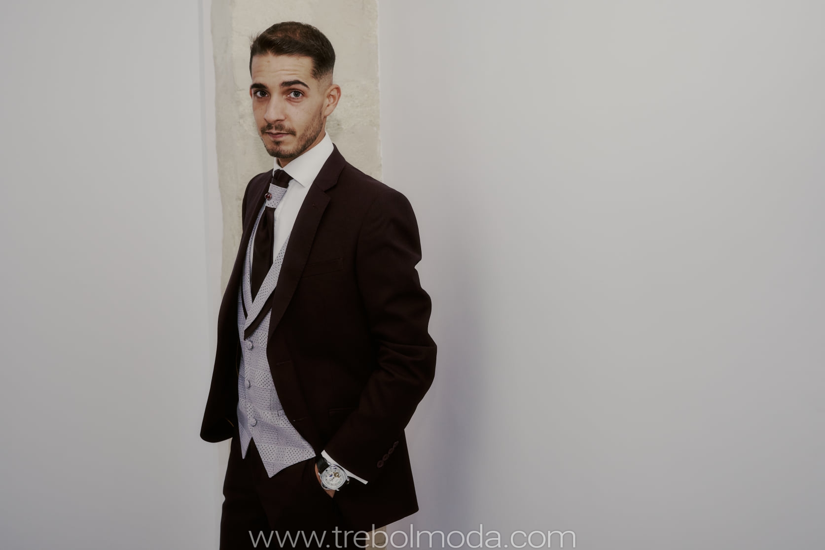 Como ejemplo, un novio con un traje nupcial en burdeos y una novia en tono rosa nude ¿Os gusta este nuevo matrimonio?