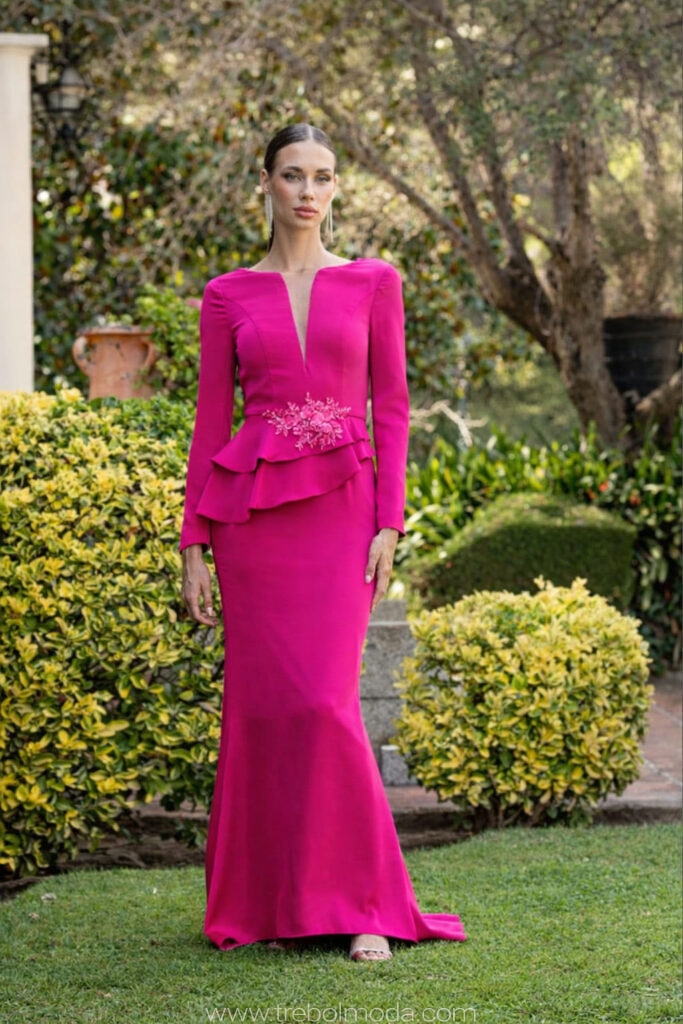 - Vestidos largos y fluidos: Un clásico que nunca falla. Los vestidos largos de fiesta en tejidos como la gasa, el crepe o el satén son perfectos para una boda de tarde. Optad por siluetas que favorezcan vuestra figura, como los cortes imperio, en A o los vestidos con caída.