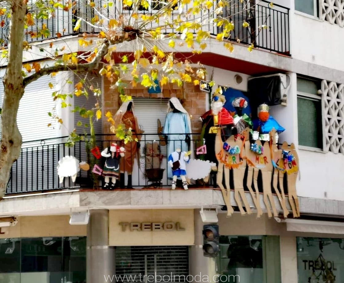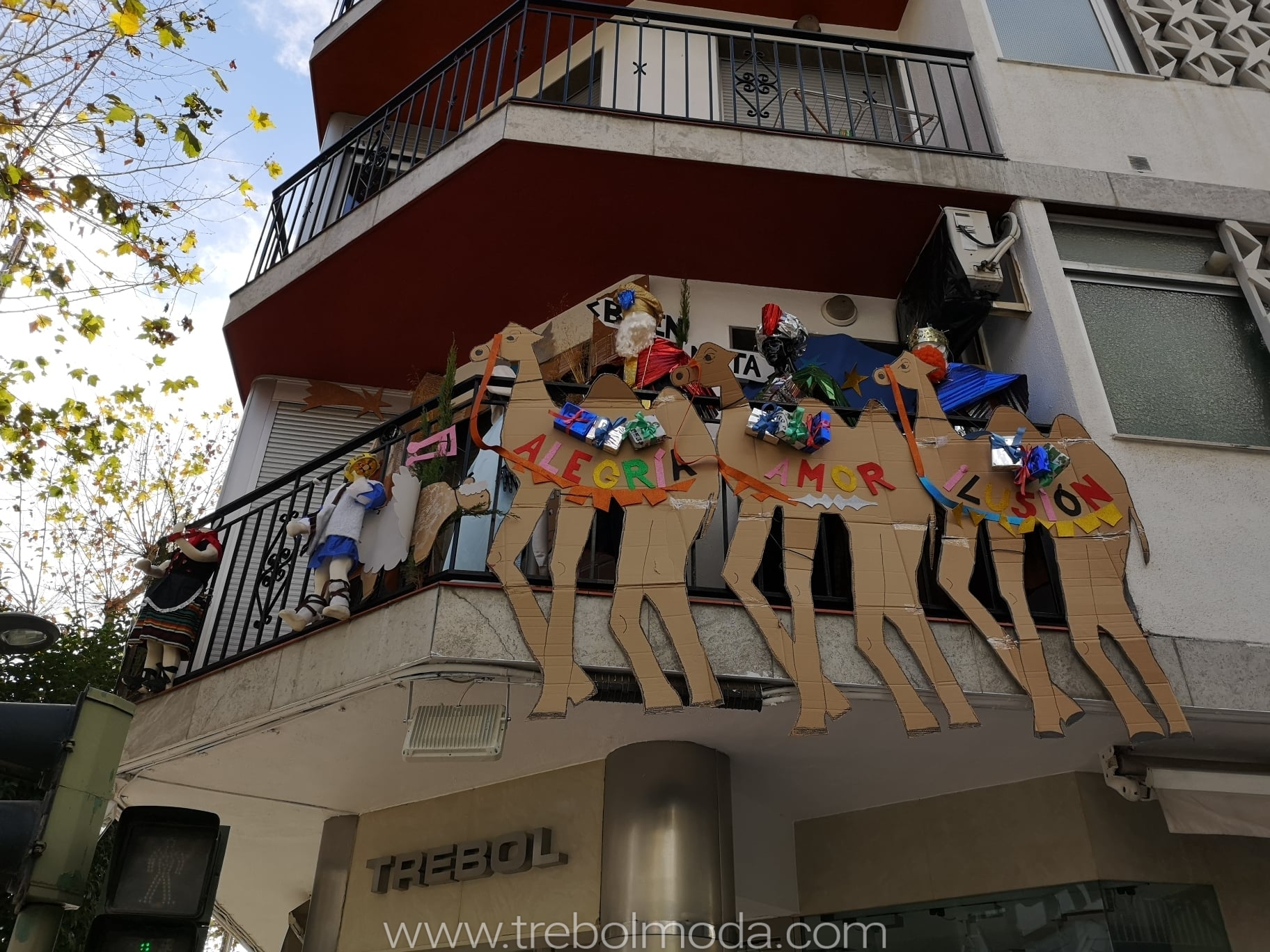 Se nos ocurrió pedirles “prestado” el balcón a nuestros vecinos del primer piso para convertirlo en un Belén a tamaño real, dónde se puede ver a S.Jose, María, el Niño Jesús, la mula, el buey, los Reyes Magos (Melchor, Gaspar y Baltasar), sus tres camellos llenos de regalos (alegría, ilusión y amor) así como a pastorcillos cuidando a su rebaño de ovejas y tocando las panderetas mientras cantan villancicos porque ha nacido el niño Dios.