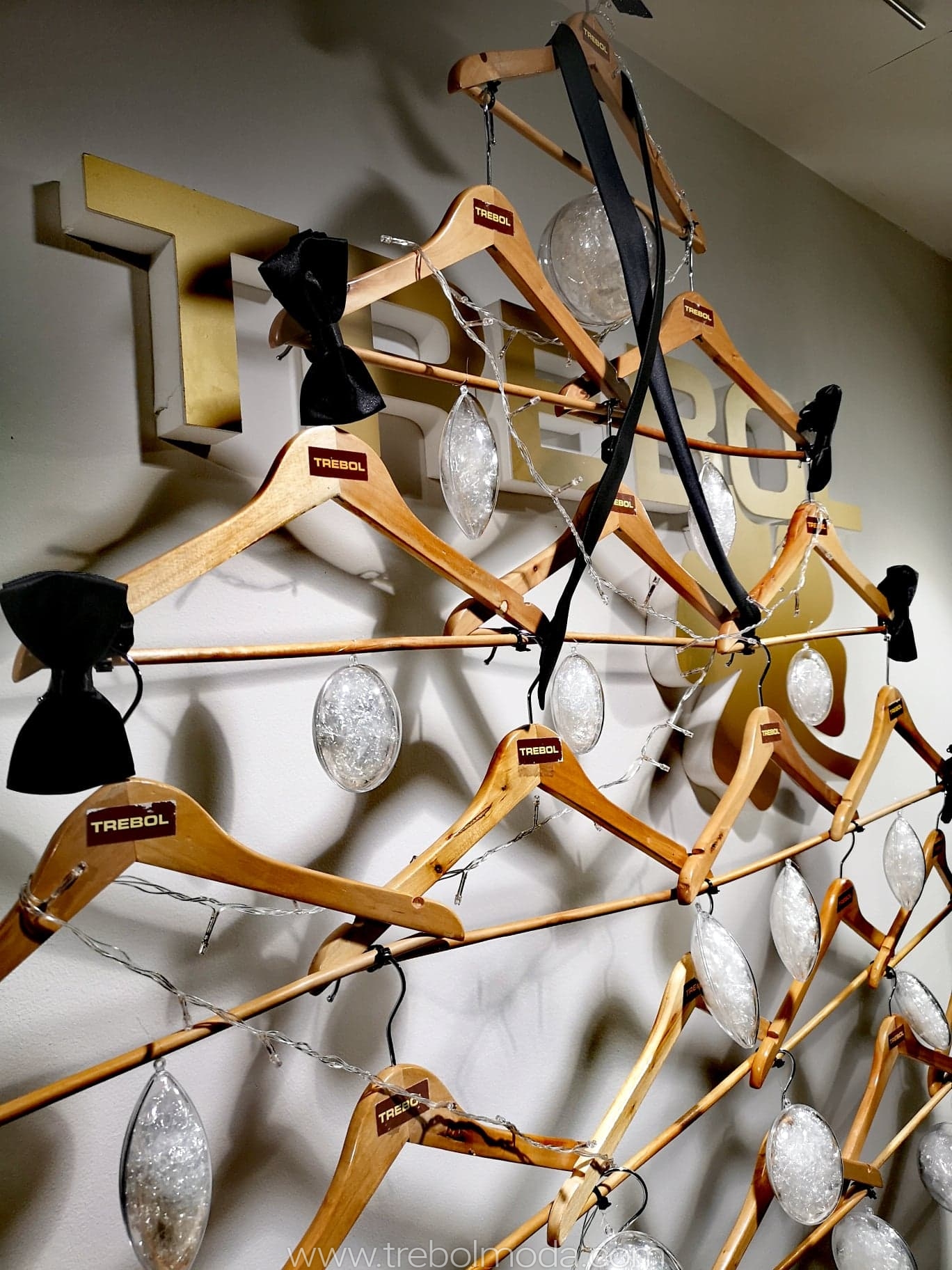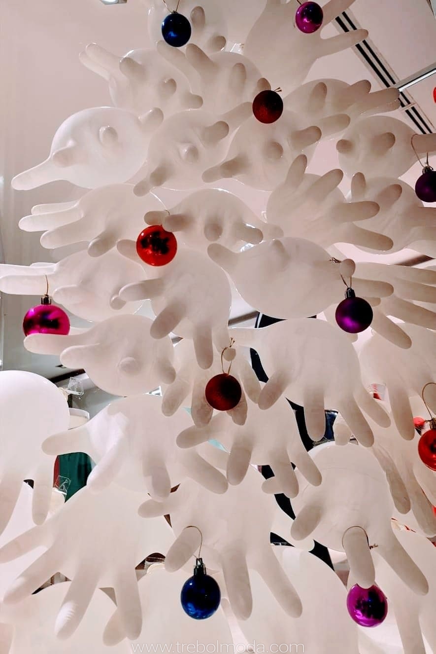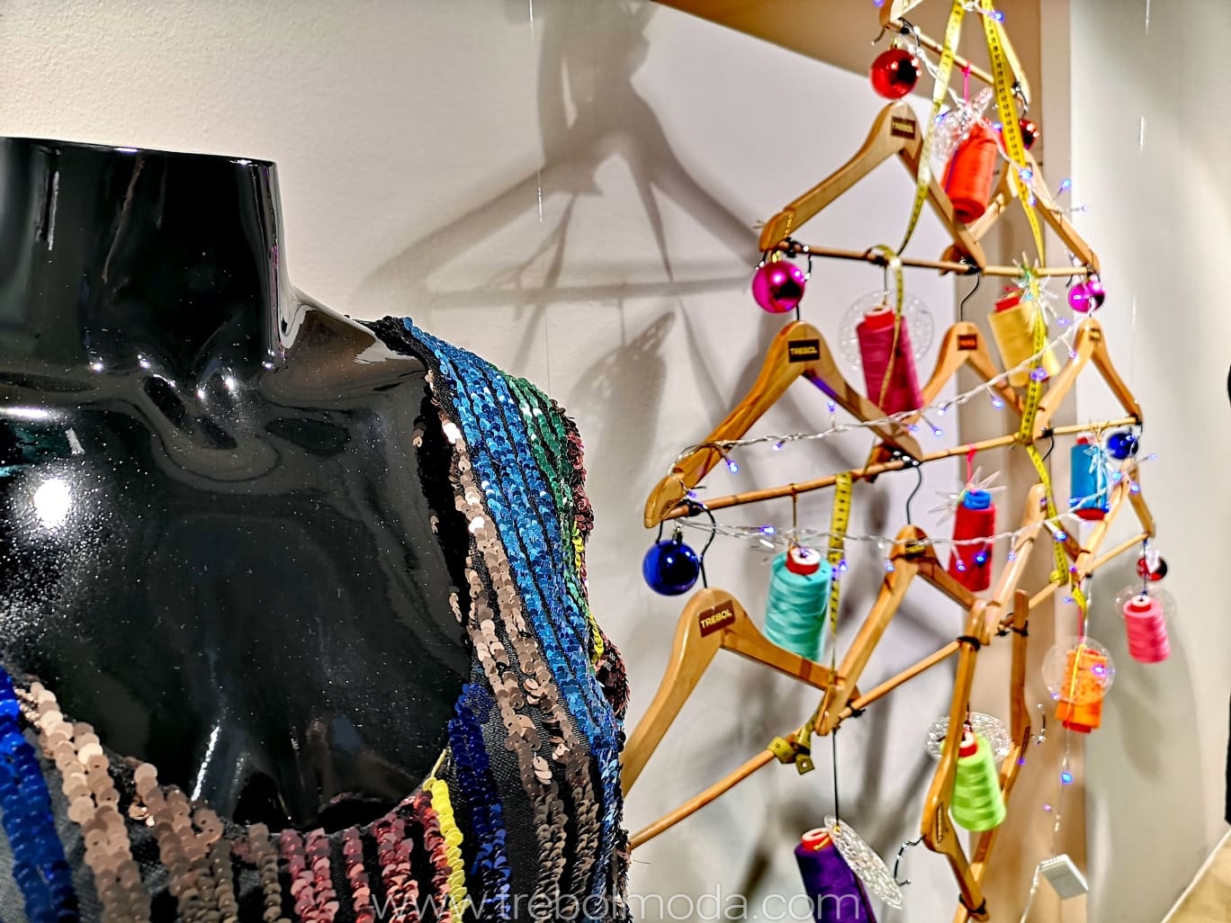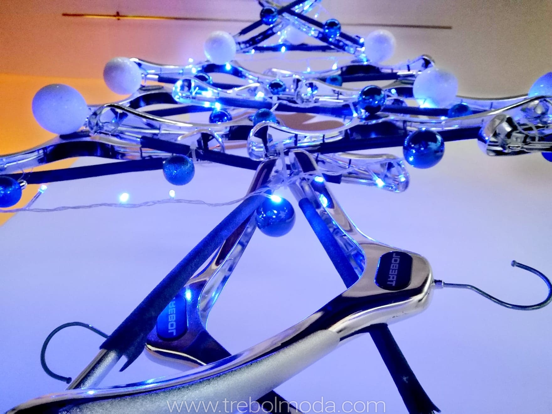 Este abeto tan peculiar formado con perchas plateadas dando una imagen futurista, iluminado en tonalidades moradas nos recuerda que cosas interesantes y novedosas nos esperan al final del túnel.