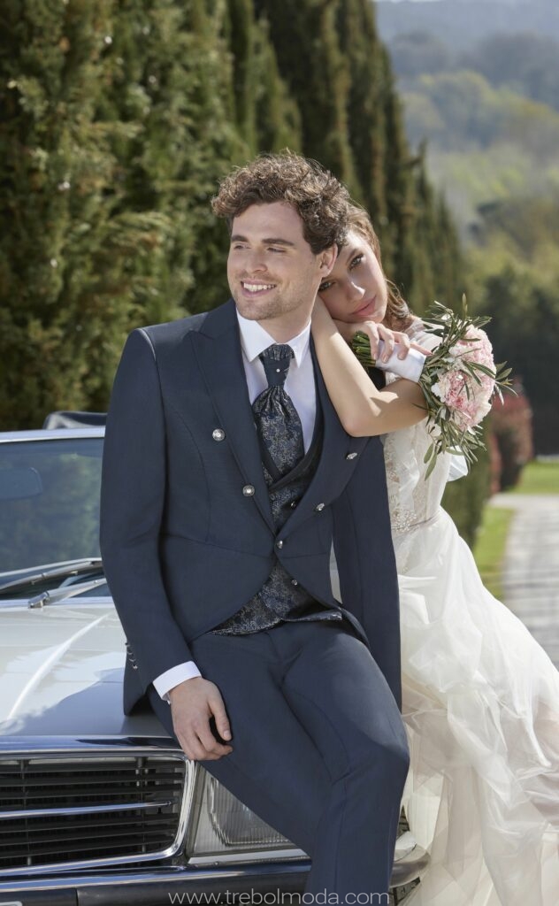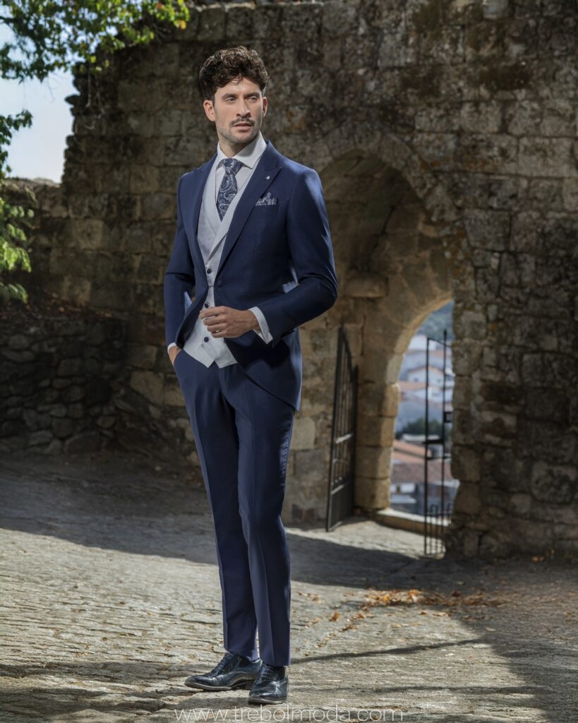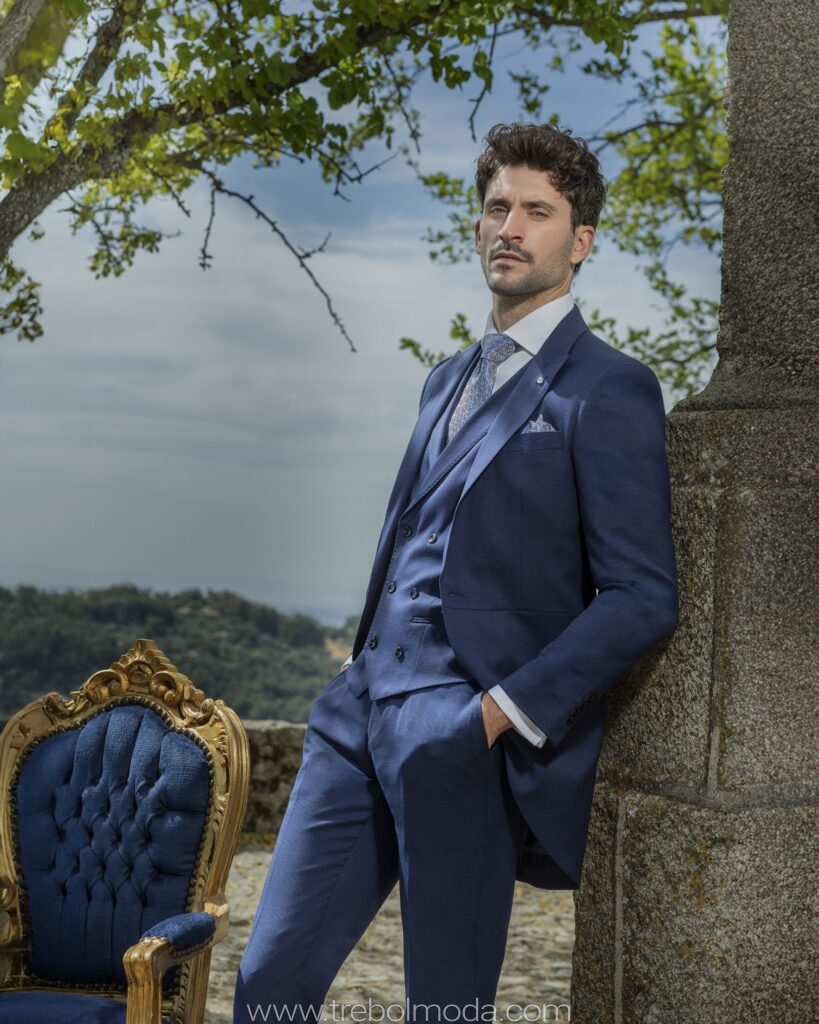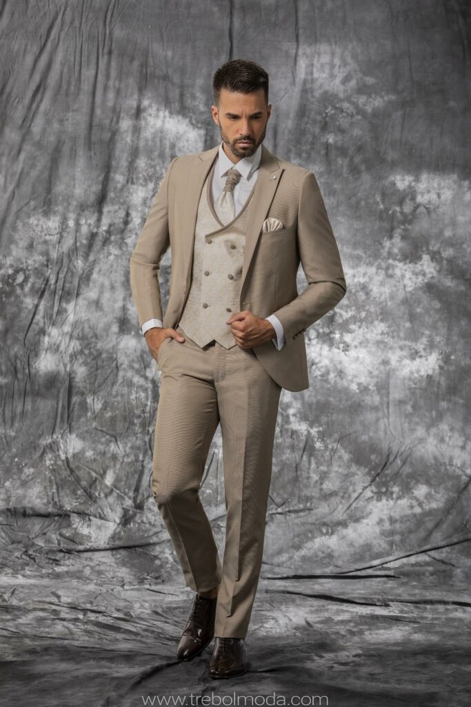 - Tejidos Naturales: La lana, el lino, el algodón y la seda son los preferidos por su caída, transpirabilidad y confort, garantizando que el novio se sienta cómodo durante toda la jornada.