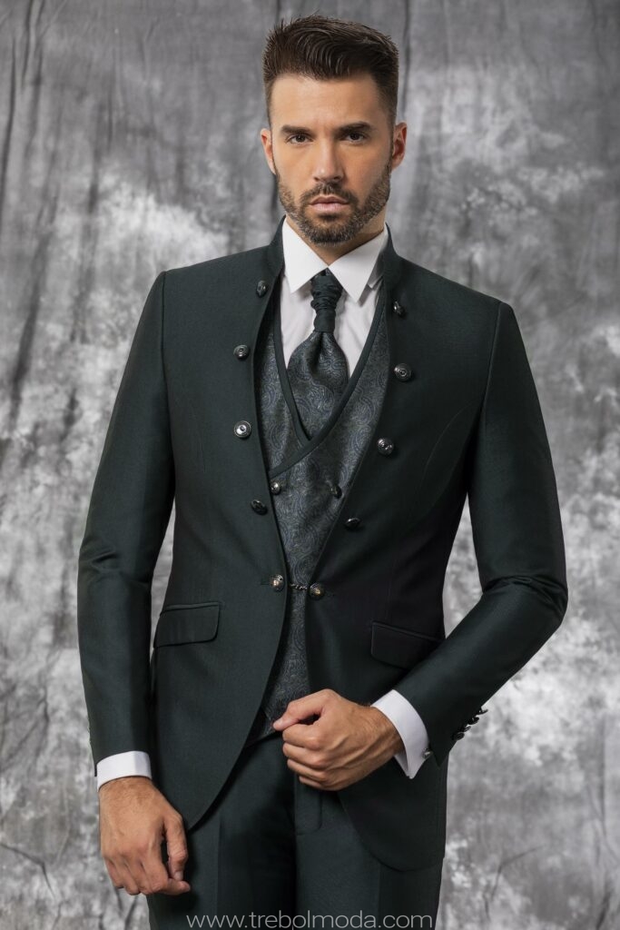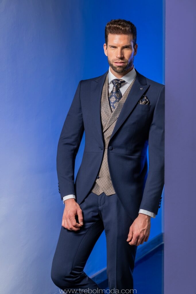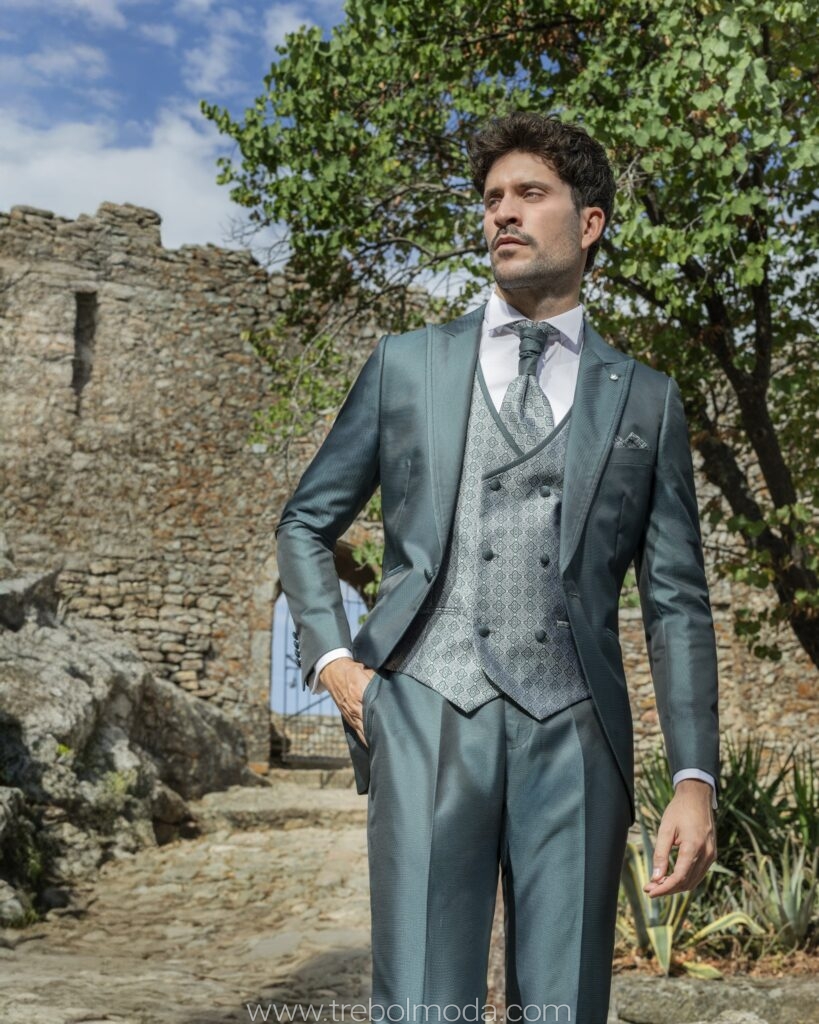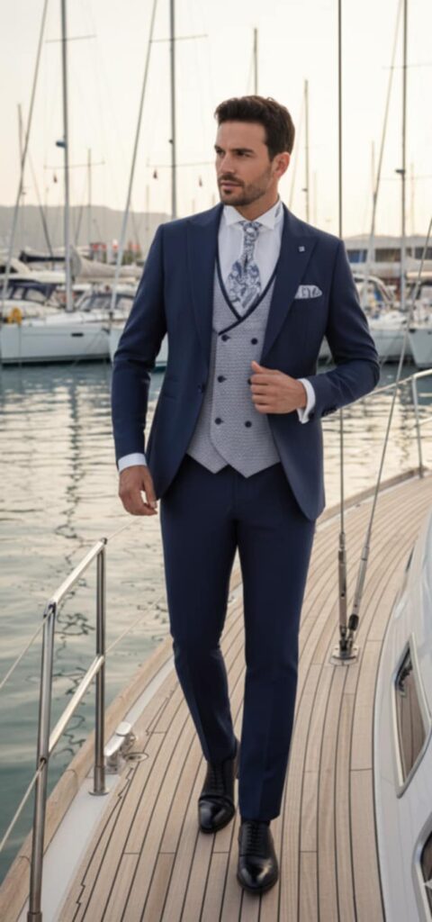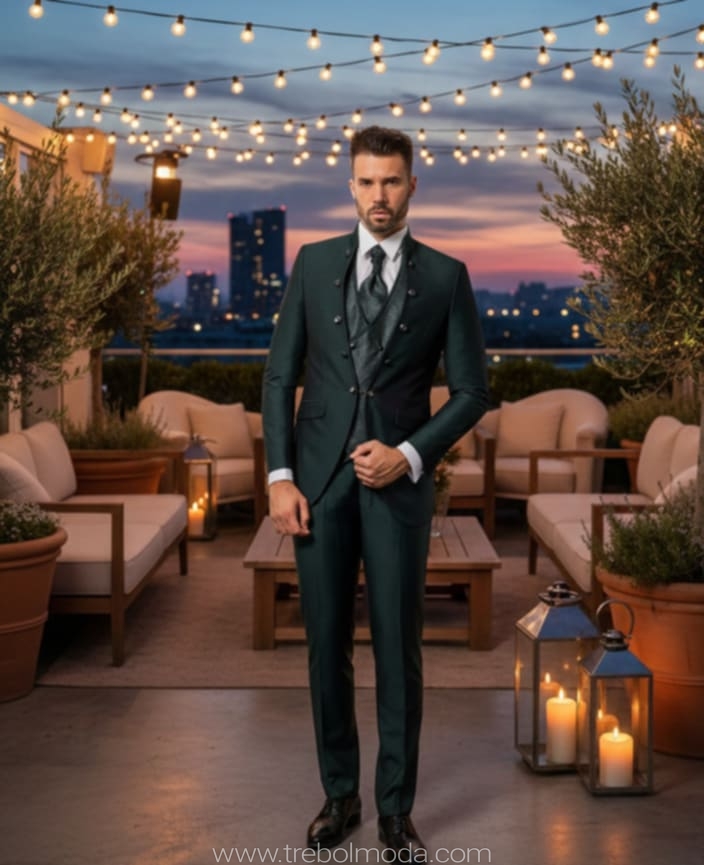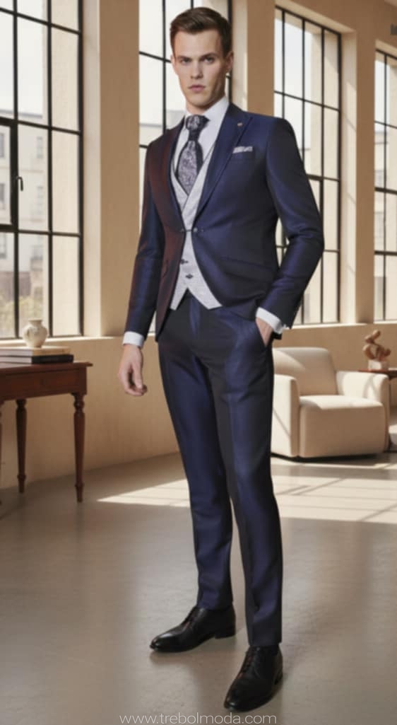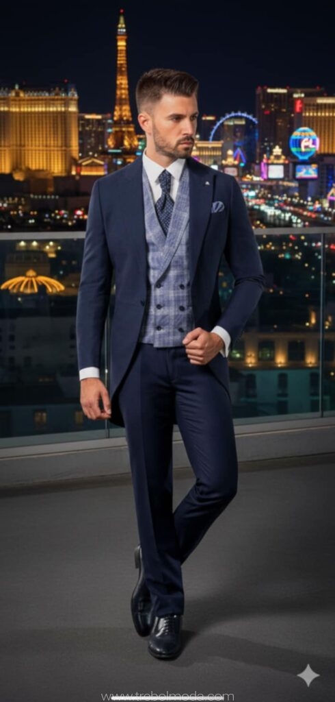 - Diseños y Siluetas: El traje de tres piezas (con chaleco) vuelve con fuerza, al igual que los trajes cruzados con cortes más ajustados y solapas estilizadas. Se priorizan los cortes modernos que definen una silueta más contemporánea y estilizada.