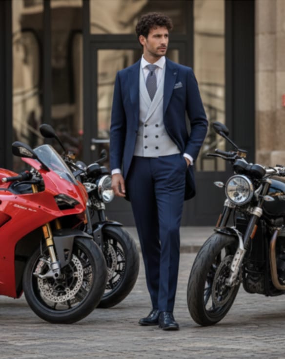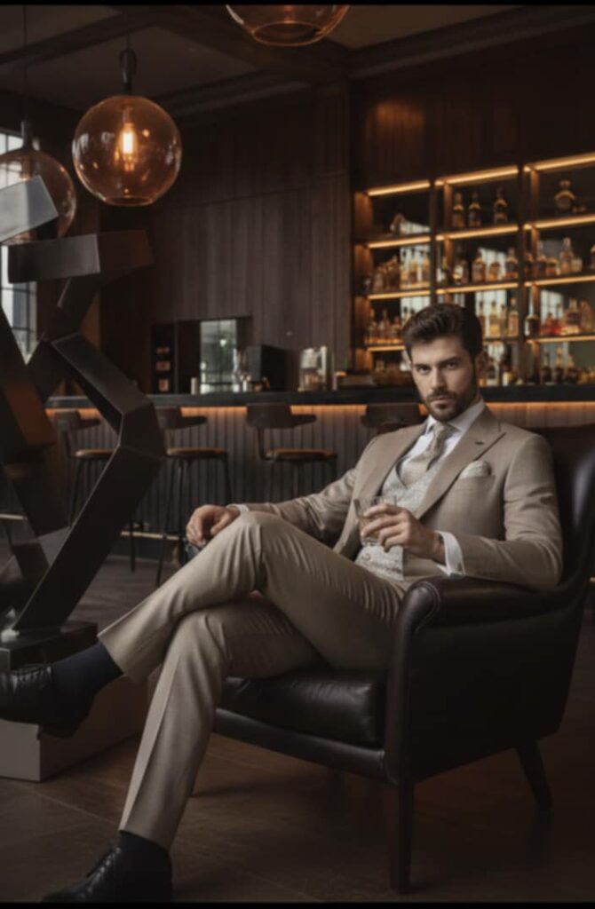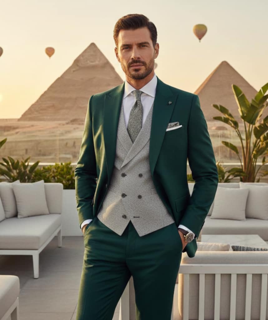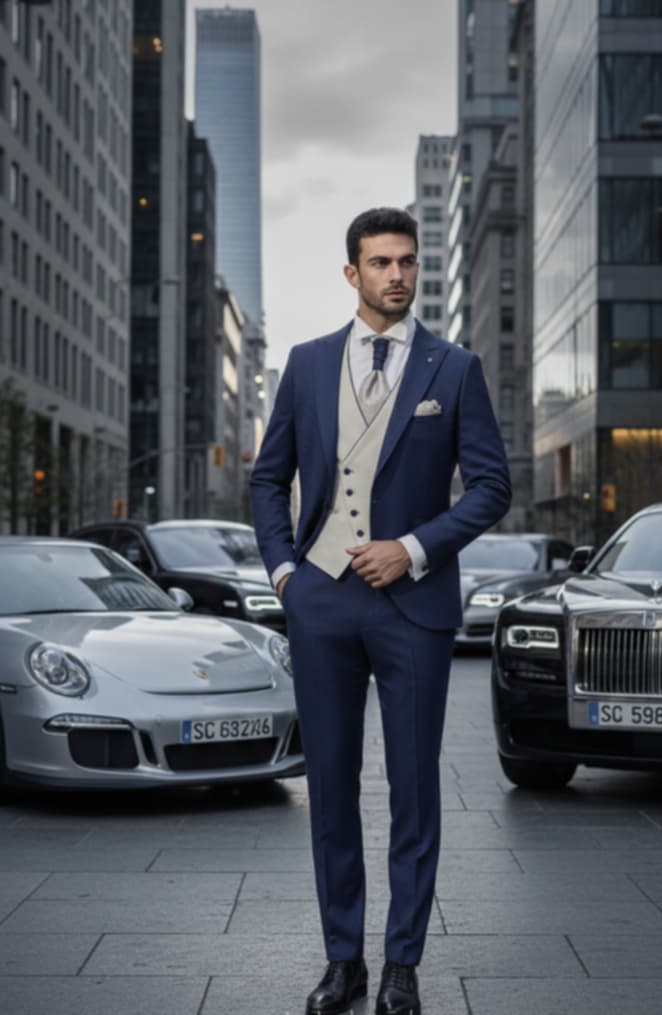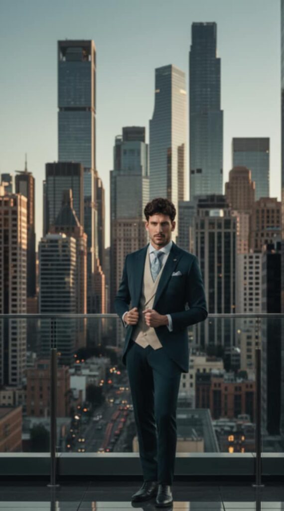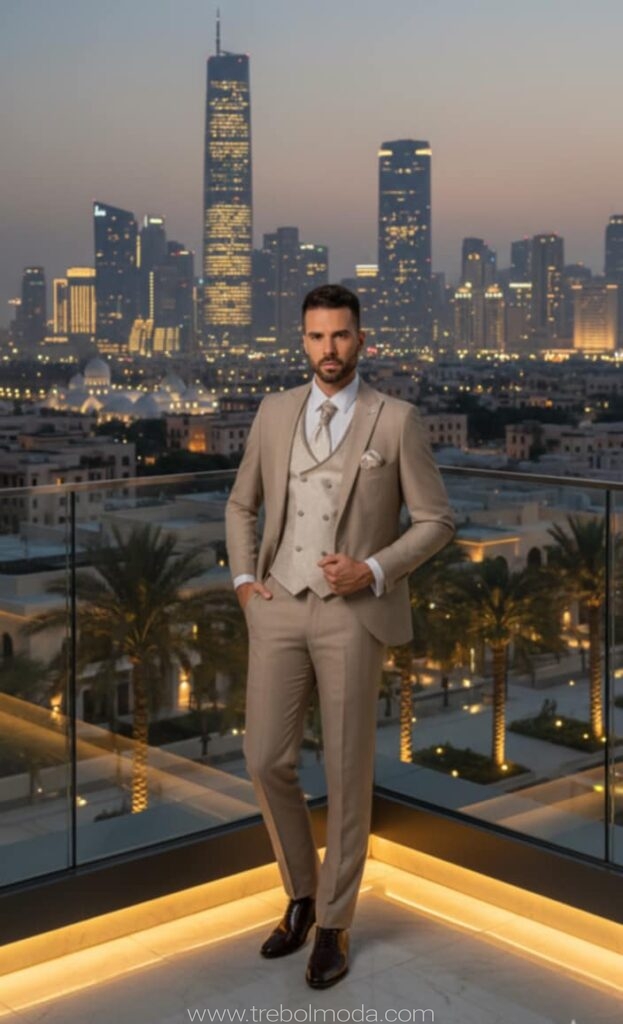 - Diseños y Siluetas: El traje de tres piezas (con chaleco) vuelve con fuerza, al igual que los trajes cruzados con cortes más ajustados y solapas estilizadas. Se priorizan los cortes modernos que definen una silueta más contemporánea y estilizada.