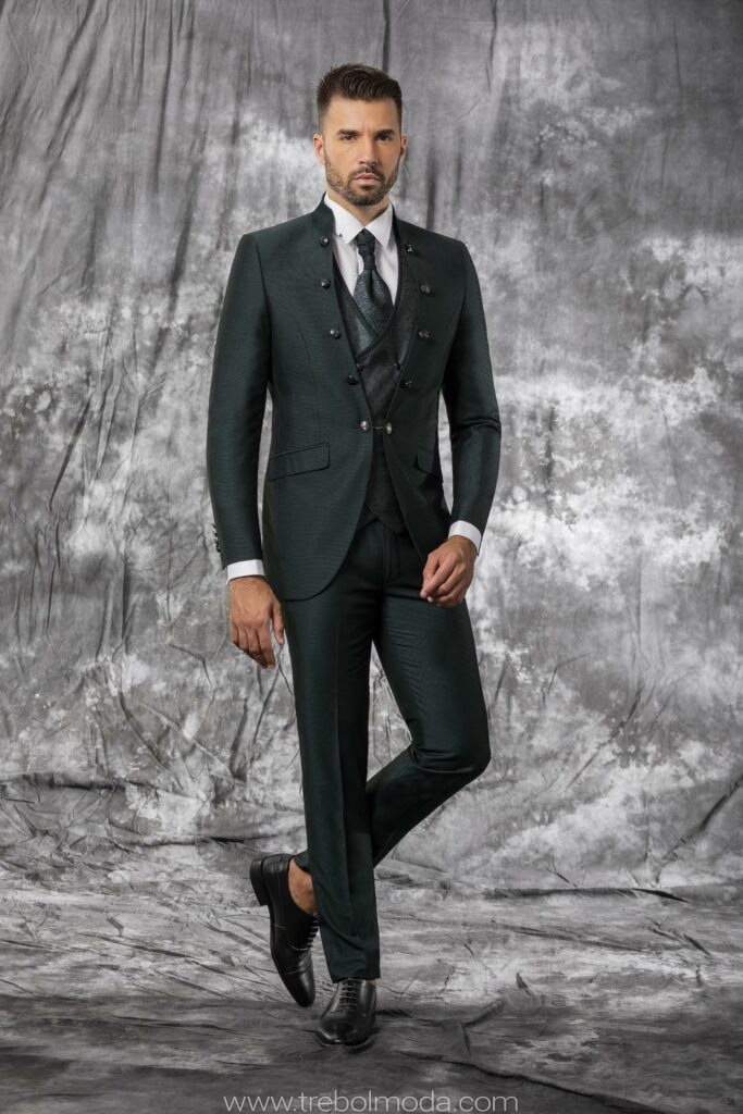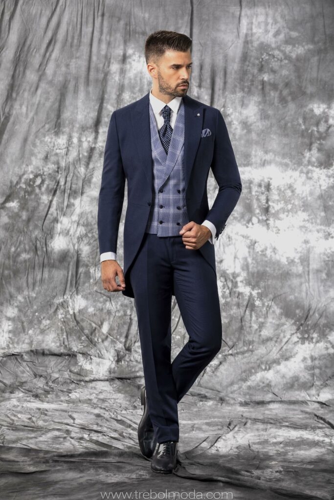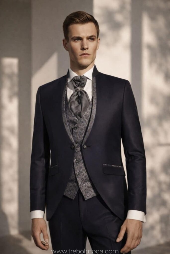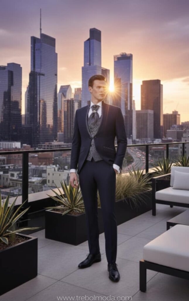 - Diseños y Siluetas: El traje de tres piezas (con chaleco) vuelve con fuerza, al igual que los trajes cruzados con cortes más ajustados y solapas estilizadas. Se priorizan los cortes modernos que definen una silueta más contemporánea y estilizada.