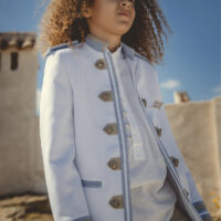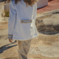 Destaca por su casaca con cuello mao y sus botones dorados.