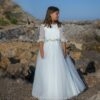 Vestido de comunión elaborado en tul en color natural, combinado con cinturón tul rosa que añade dulzura. El cuerpo presenta una espalda en pico con una tira bordada que realza la elegancia. La falda cuenta con rizo y volumen, brindando comodidad y estilo.