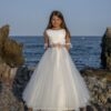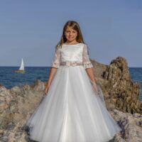 Vestido de comunión elaborado en tul en color natural, combinado con tul rosa en el cinturón que añade dulzura. El cuerpo presenta una espalda en pico con una tira bordada que realza la elegancia.