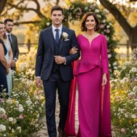 Este vestido de madrina en un vibrante color destaca por su diseño moderno y sofisticado. Con un elegante escote en V y mangas tres cuartos, el vestido presenta un detalle en la cintura (cinturón con plumas).
