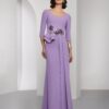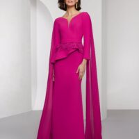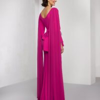 Este vestido de madrina en un vibrante color destaca por su diseño moderno y sofisticado. Con un elegante escote en V y mangas tres cuartos, el vestido presenta un detalle en la cintura (cinturón con plumas). La capa fluida en la espalda añade movimiento y un toque de elegancia al conjunto (sujeta en los hombros, desmontable). Ideal para bodas y eventos formales, este vestido ofrece una silueta estilizada y un estilo atemporal que resalta la figura.