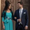 Este vestido de madrina en un vibrante color destaca por su diseño moderno y sofisticado. Con un elegante escote en V y mangas tres cuartos, el vestido presenta un detalle en la cintura (cinturón con plumas).
