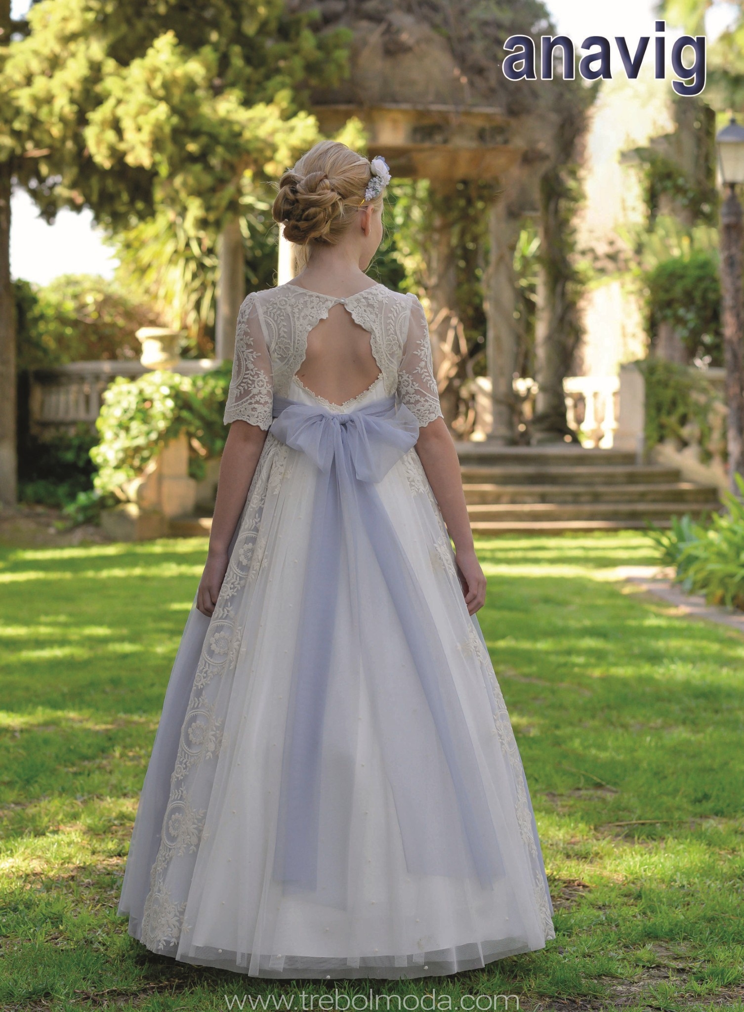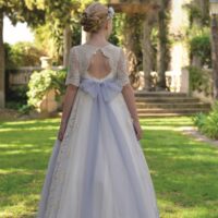 Vestido de comunión elaborado en tul bordado de color natural, combinado con tul azul que aporta elegancia. Su cuerpo presenta un delicado bordado, con escote redondeado en el delantero y una espalda trasparente que realza la belleza. La falda lleva una abertura en la parte lateral, añadiendo un toque sofisticado. Un cinturón decorado con guipur y un lazo en la espalda completan este hermoso vestido, perfecto para la ocasión.