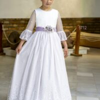 Vestido de comunión largo, de estilo romántico. Confeccionado en tul con fajín y flor de adorno. Presenta escote redondo, manga francesa y espalda en V.