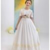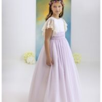 Vestido de comunión en tul de color natural, con una elegante falda combinada con tul lila en la base. El cuerpo presenta bodoques en tul y escote redondo, acompañado de mangas bordadas en tul. La espalda destaca por un delicado lazo, añadiendo un toque romántico y sofisticado a esta hermosa prenda para ocasiones especiales.