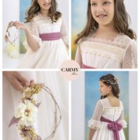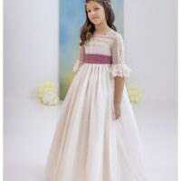 Vestido de comunión elaborado en tul de topos color marfil, que aporta un toque delicado y elegante.