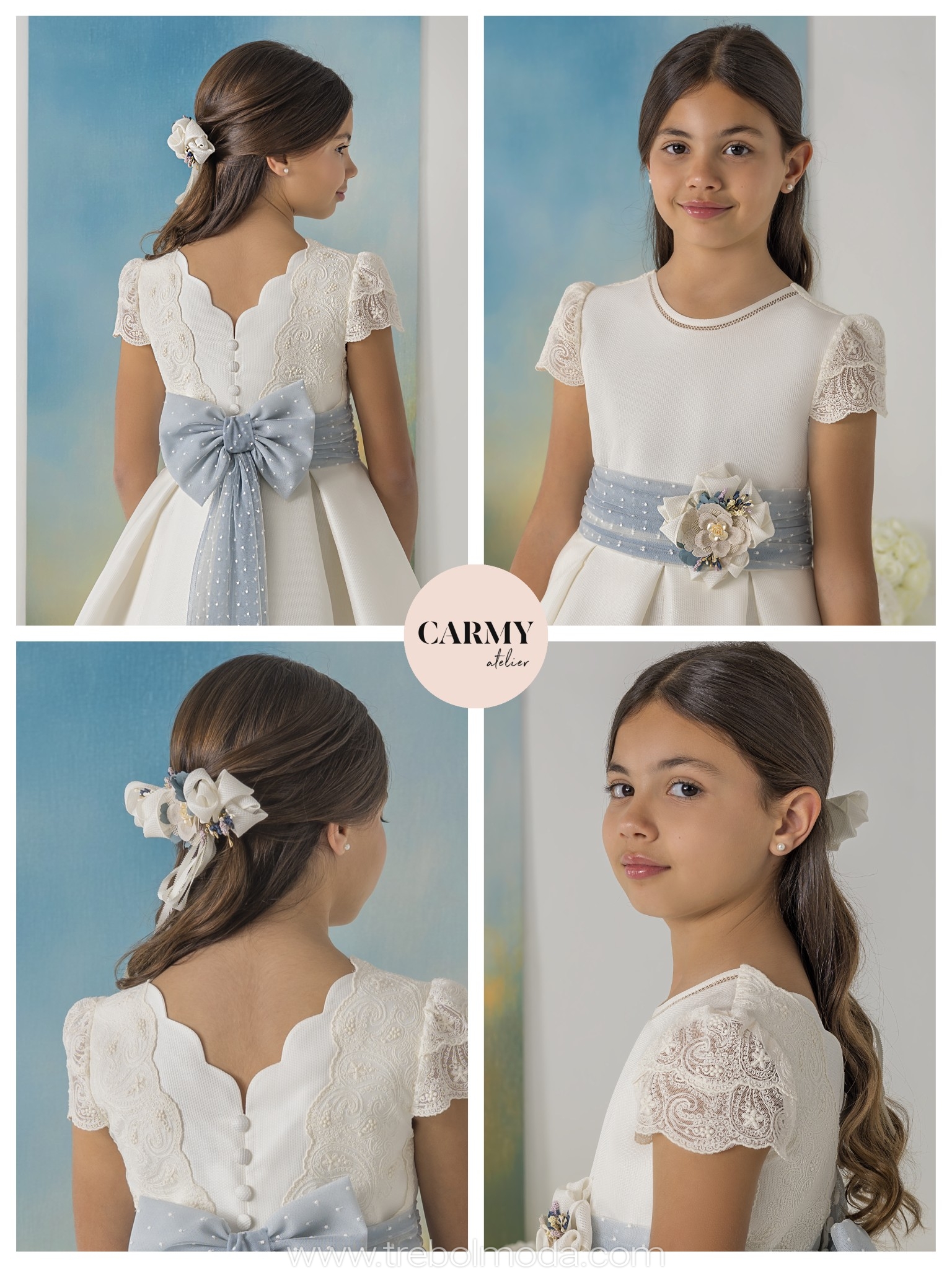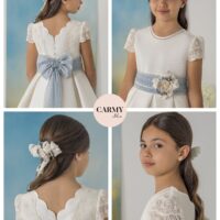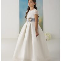 Vestido de comunión estilo clásico, elaborado en esterilla de poliéster color marfil. Tiene un cuerpo con escote redondo en el frente y espalda con ondas y tira bordada.