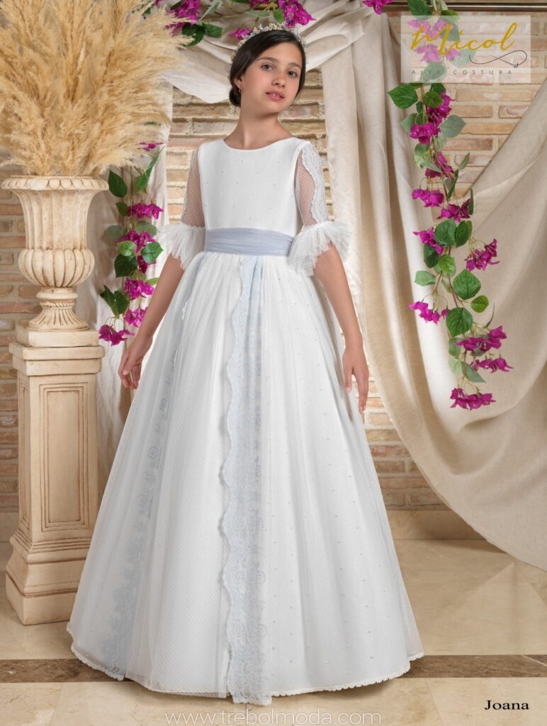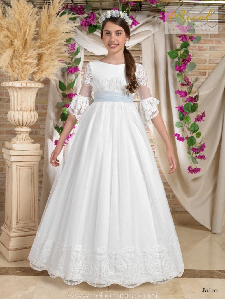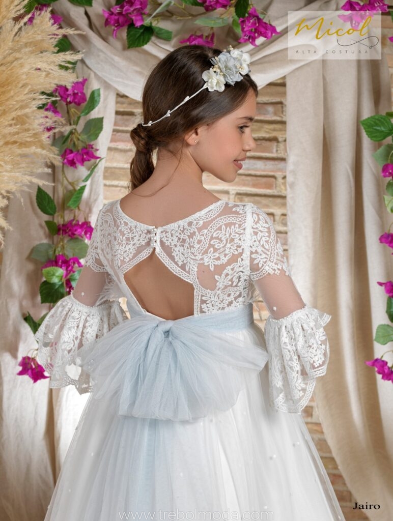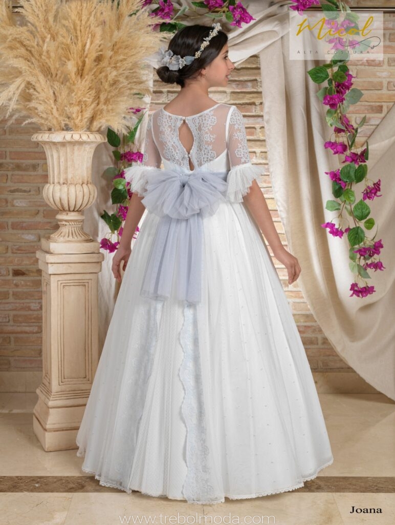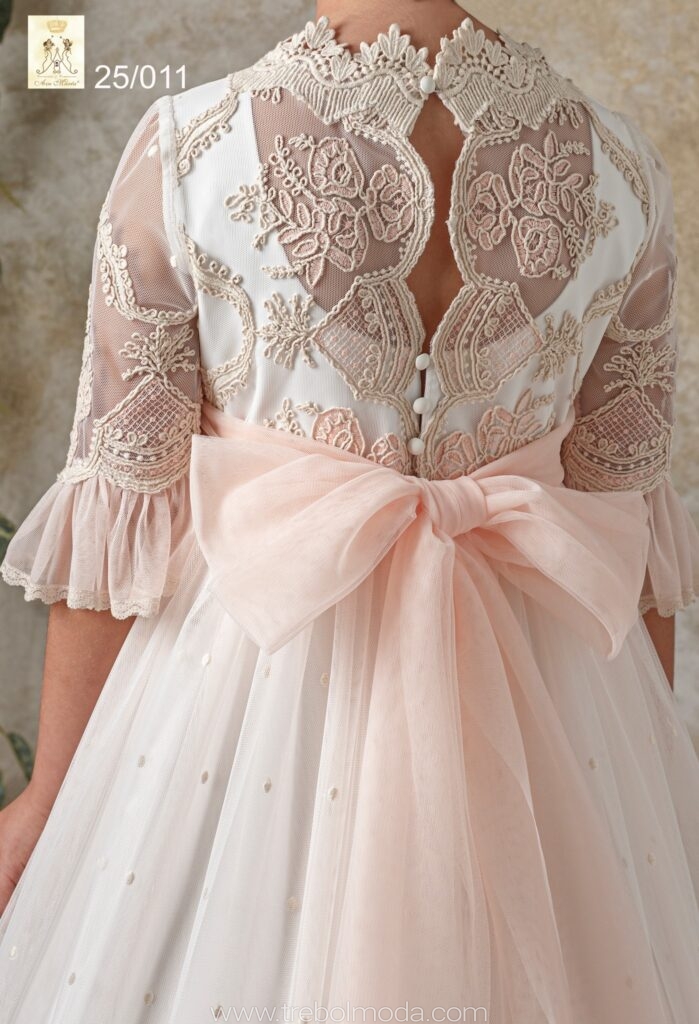 Vestido de comunión elaborado en tul de color natural, con un delicado cuerpo adornado con puntillas en marfil y jaretas que resaltan su elegancia.