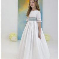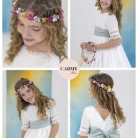 Vestido de comunión elaborado en lino natural, que ofrece comodidad y elegancia. Su cuerpo presenta un escote redondo en la parte delantera y una espalda en pico, ambos rematados con delicada puntilla.