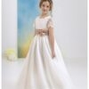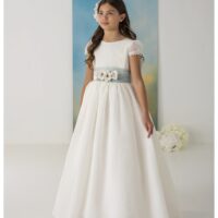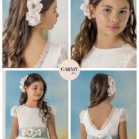 Vestido de comunión elaborado en esterilla rústica color marfil, que combina sencillez y elegancia. Su cuerpo presenta bodoques bordados y delicada puntilla, junto con mangas cortas que aportan frescura.