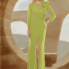 Escote delantero en pico y espalda cerrada con cremallera invisible.