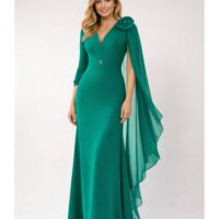 Presenta un favorecedor escote en pico y una capa asimétrica de gasa que cae con suavidad en el hombro izquierdo, aportando movimiento y sofisticación.
