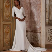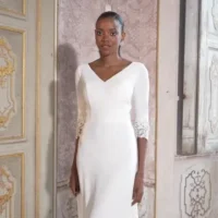 Un vestido ajustado de crepé de manga larga con delicados detalles de encaje en los puños