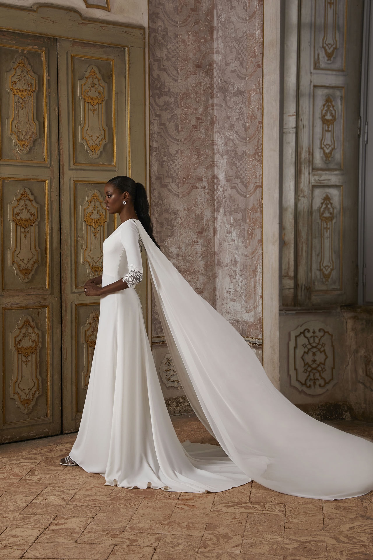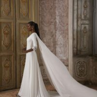 La cola en crepe de gasa es desmontable (se puede usar también a modo de capa en los hombros)
