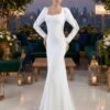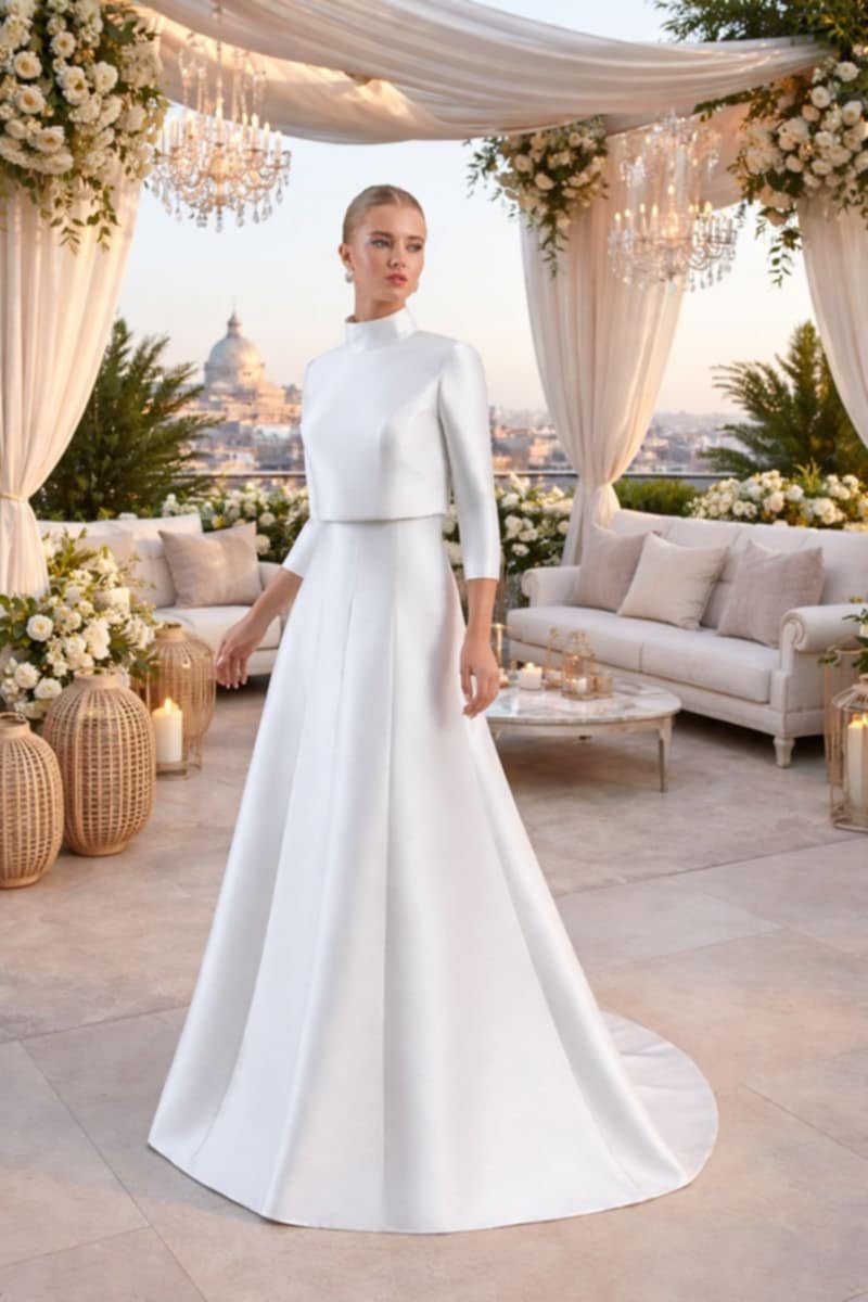 Este vestido de corte A con escote palabra de honor se distingue por sus costuras redondeadas en relieve y una falda godet que aporta movimiento. La silueta es estructurada pero fluida, pensada para una novia que busca sofisticación con un toque arquitectónico.