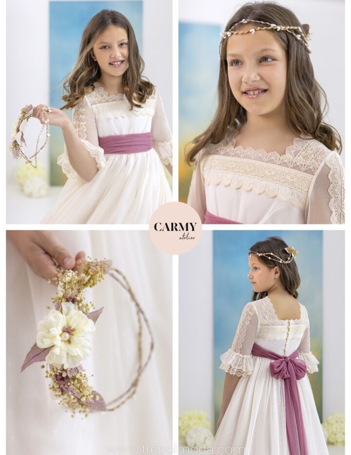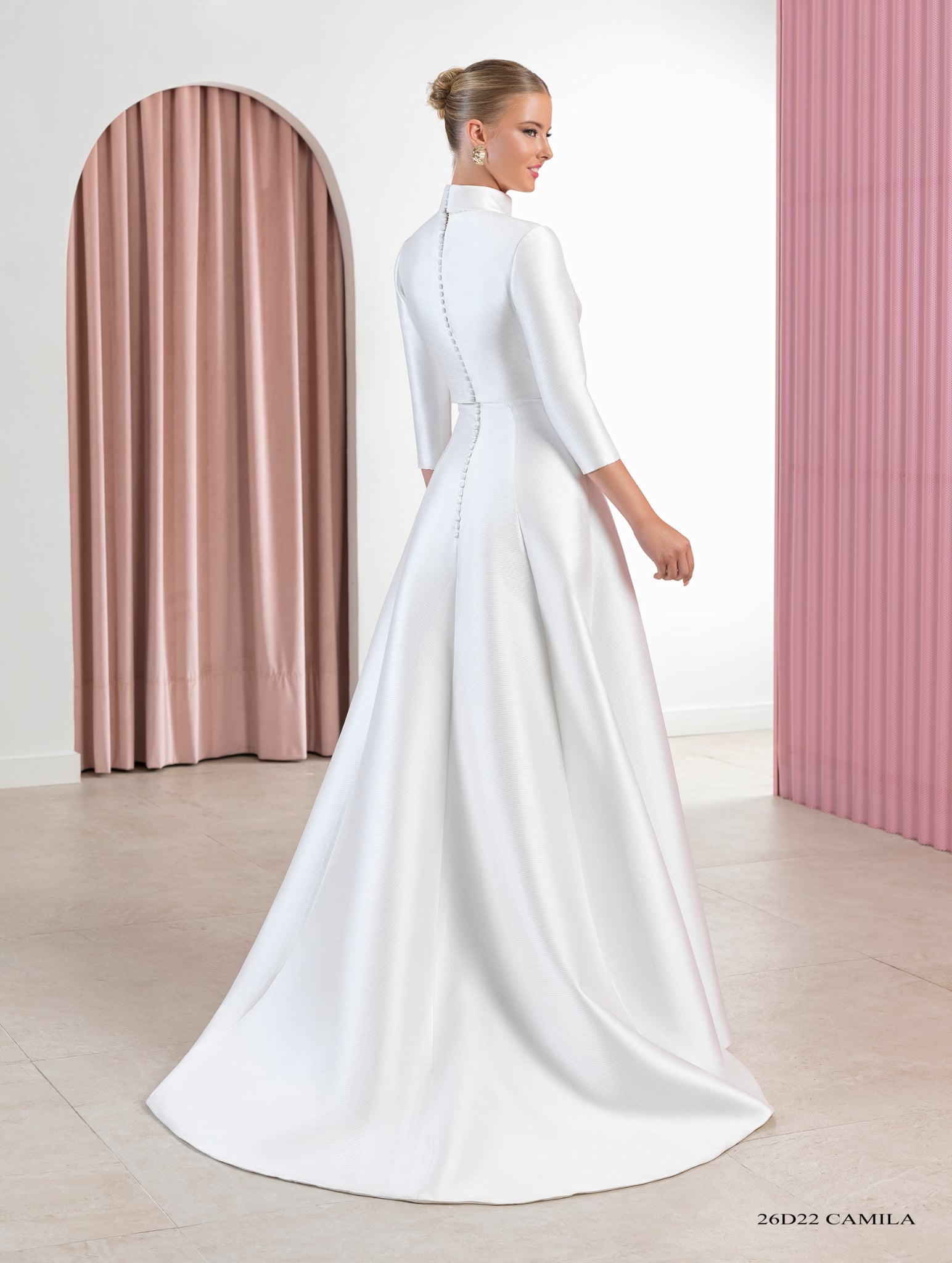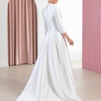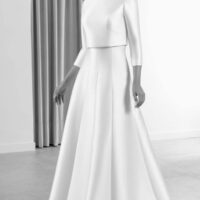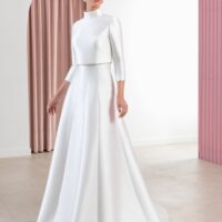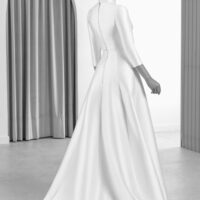 Este vestido de corte A con escote palabra de honor se distingue por sus costuras redondeadas en relieve y una falda godet que aporta movimiento. La silueta es estructurada pero fluida, pensada para una novia que busca sofisticación con un toque arquitectónico.