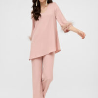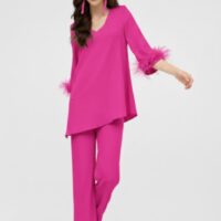 Compuesto por una casaca fluida con mangas al codo rematadas con “plumitas” (desmontables) y un pantalón recto con cremallera invisible lateral.