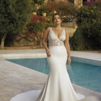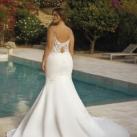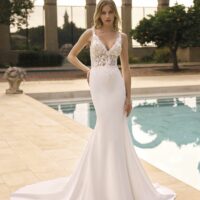 El crepé y las cuentas se combinan en una silueta elegante y envolvente, pensada para una novia que busca sofisticación con carácter.