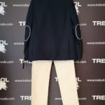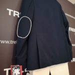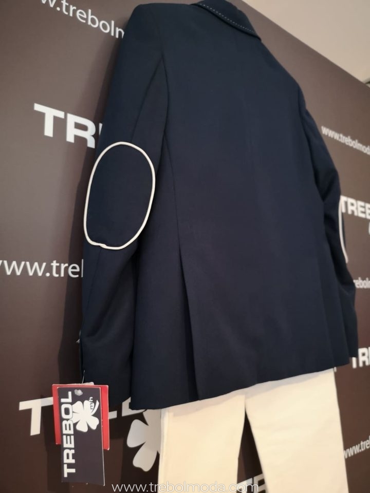 -Americana o blazer marino con solapa cerrada en dos botones. Espalda entallada con dos aberturas. Bolsillos con tapetas y pespuntes en solapa y coderas coordinados siempre en color beige. Composición 65% poliester y 35 % viscosa.