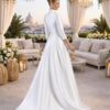 Vestido de novia que simula dos piezas, falda estilo sirena, y cuerpo con estructura de corsé. Falda de crepé bielástico, con larga cola.