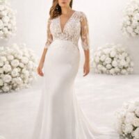 Vestido de novia sirena con escote en pico, con mangas 3/4 en crepe y encaje. Falda en georgette de gasa con gran cola.