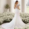 Vestido de corte sirena con escote en corazón, en crepé y chantilly.