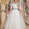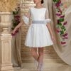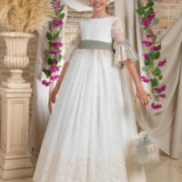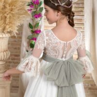 Vestido de comunión elaborado en tul marfil con delicados topos, combinado con tul verde que aporta un toque fresco y elegante. El cuerpo presenta un escote que realza la figura, mientras que la cintura está adornada con una delicada puntilla y un hermoso lazo en la espalda. La falda de volumen añadiendo un toque de sofisticación y comodidad para la niña en su día especial.