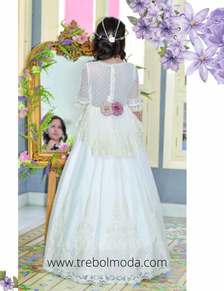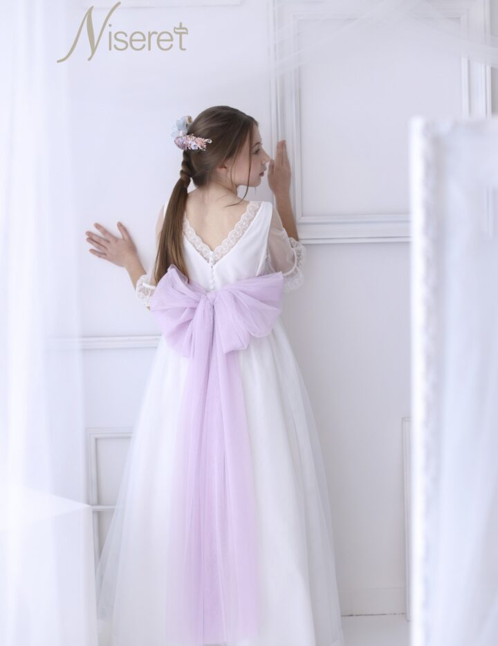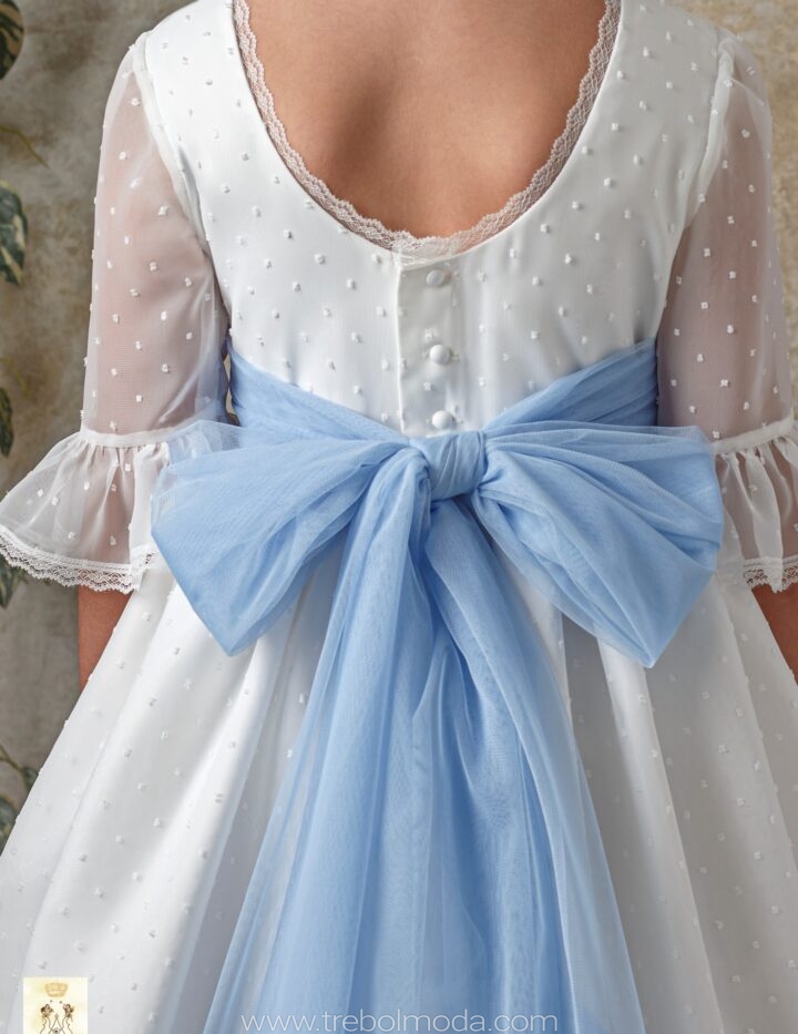 Vestido de comunión elaborado en tul marfil con delicados topos, combinado con tul verde que aporta un toque fresco y elegante. El cuerpo presenta un escote que realza la figura, mientras que la cintura está adornada con una delicada puntilla y un hermoso lazo en la espalda. La falda de volumen añadiendo un toque de sofisticación y comodidad para la niña en su día especial.