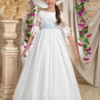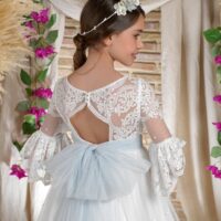 Vestido de comunión de talle normal y estilo romántico, realizado en tul con detalles en chantilly. Presenta un escote redondo, una espalda ilusión y manga corta. Se completa con un fajín con plumas y un lazo de adorno en la espalda.