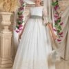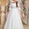 Vestido de comunión largo de estilo romántico. Confeccionado en tul bordado con adornos de plumas en los hombros. Presenta escote barco y falda de organza.