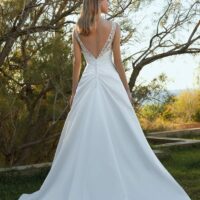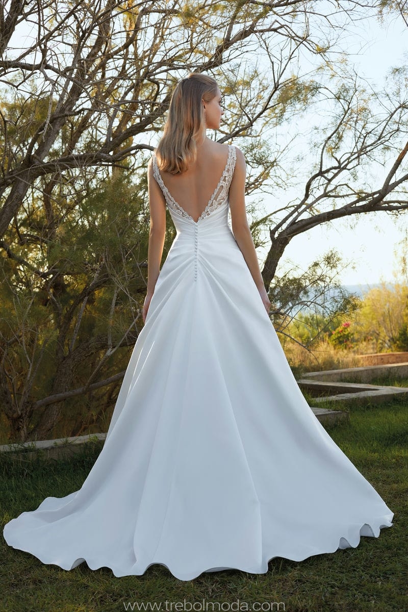 Vestido de novia ideal por su drapeado entre cintura y cadera porque disimula barriguita y estiliza la figura.