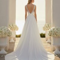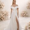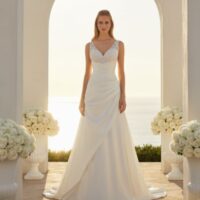 Vestido de novia ideal por su drapeado entre cintura y cadera porque disimula barriguita y estiliza la figura.