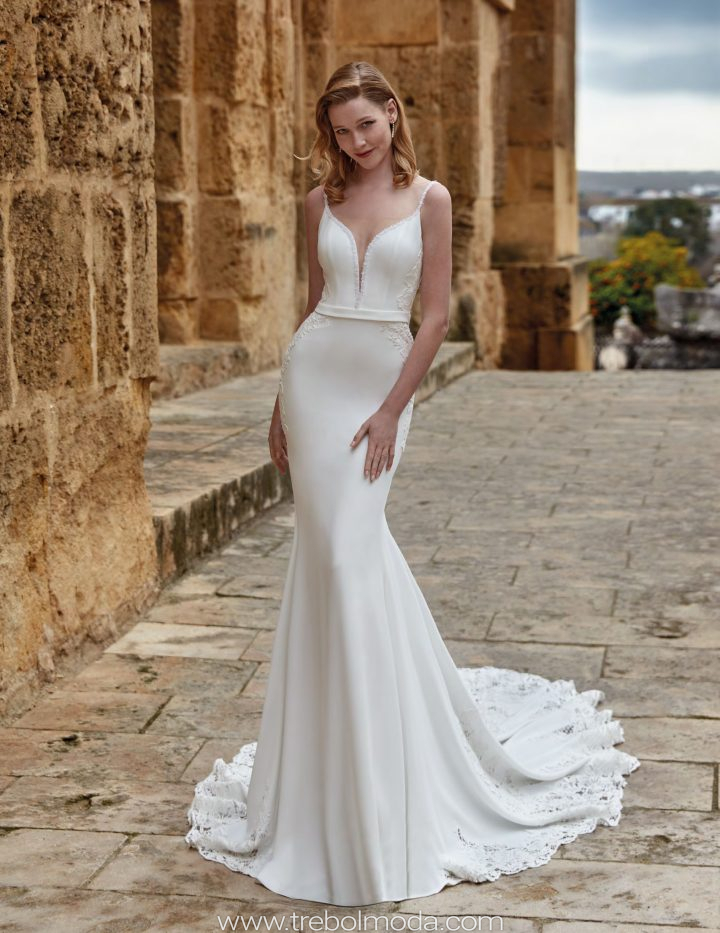 Vestido de novia con manguitas cortas. Original cuello con puntas bordadas haciendo efecto “tattoo”.