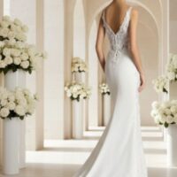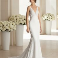 Vestido de novia estilo sirena que destaca por su larga cola adornada en los laterales por un precioso encaje compañero al cuerpo.