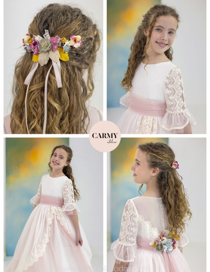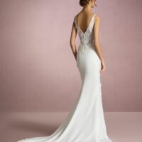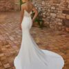 Vestido de novia estilo sirena que destaca por su larga cola adornada en los laterales por un precioso encaje compañero al cuerpo.