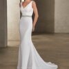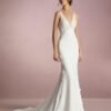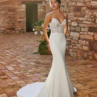 Vestido sirena en crepé con suaves contornos y un sutil guipur. Corpiño tipo corsé y tirantes de lencería extraíbles. El diseño de la falda crea un efecto fluido en la cola. Espalda profunda con cremallera invisible.