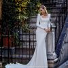 Escote pico, espalda escotada y manga larga. Con transparencias, adorno de vainica y cola en georgette.