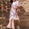Un modelo triunfador por su top crop y su falda drapeada con abertura.