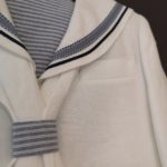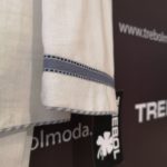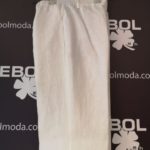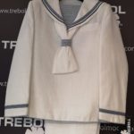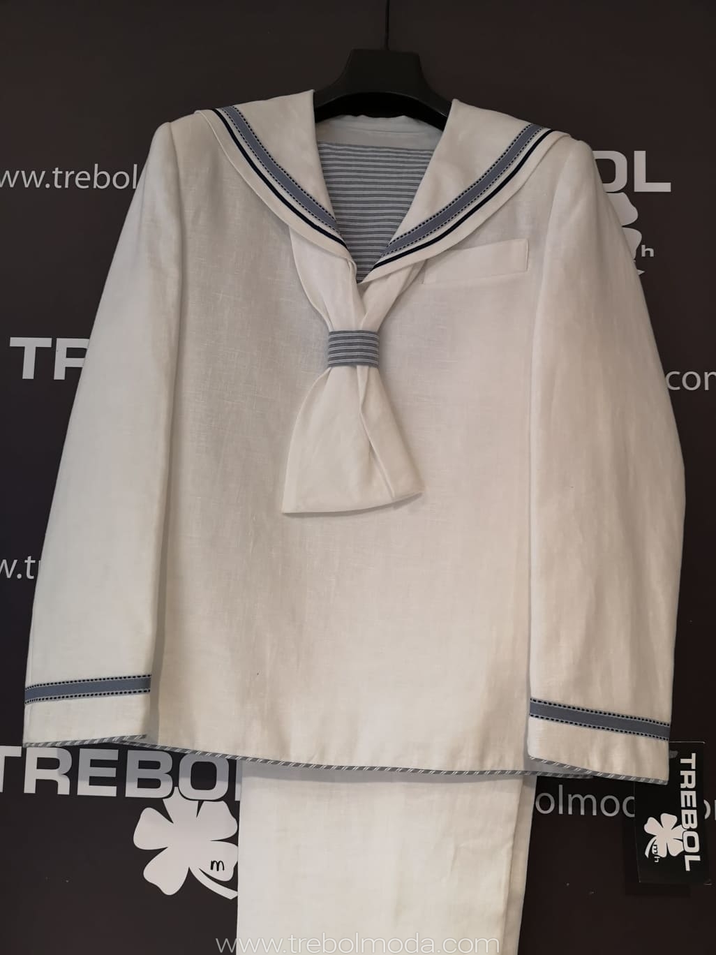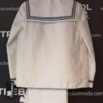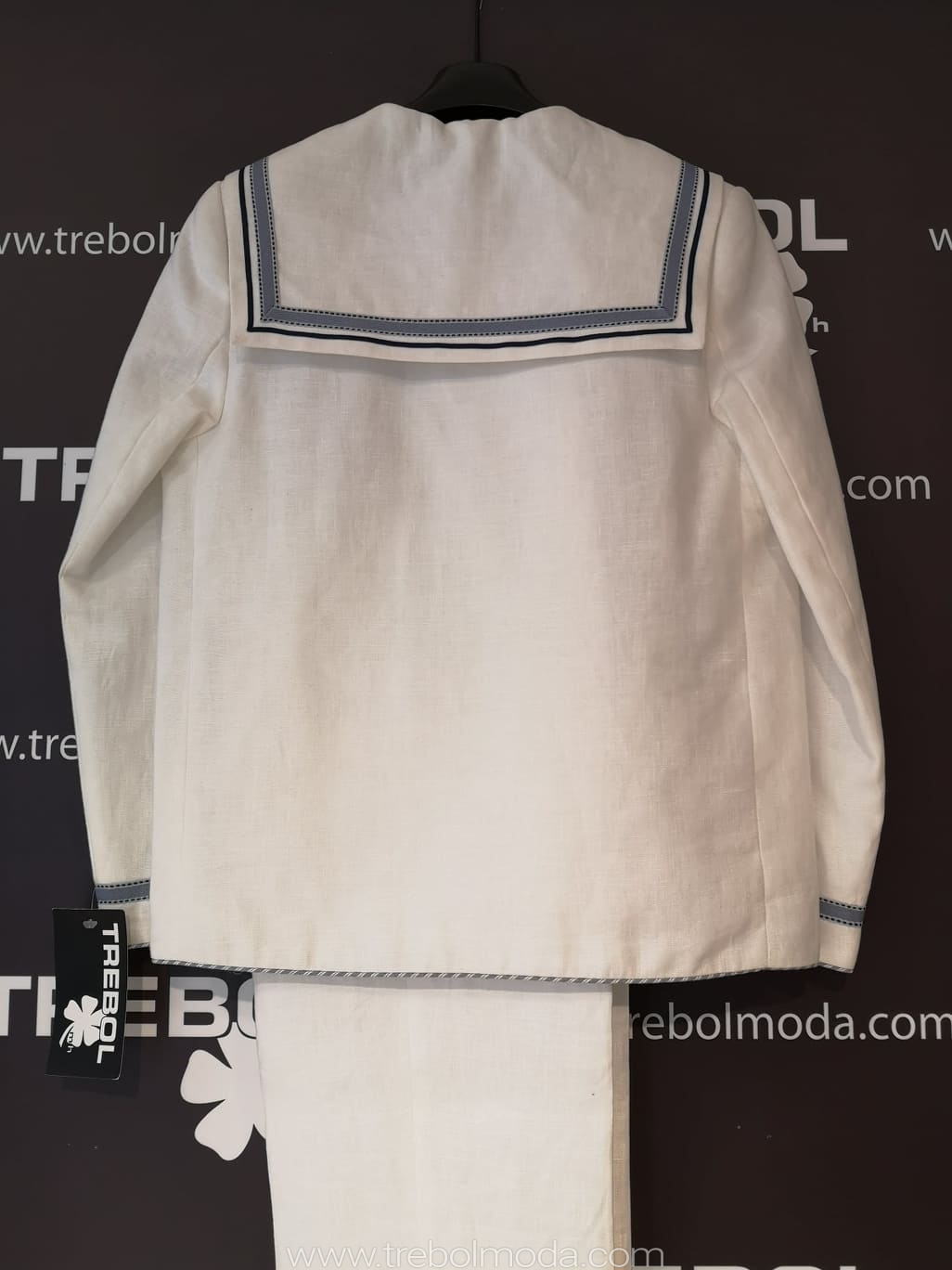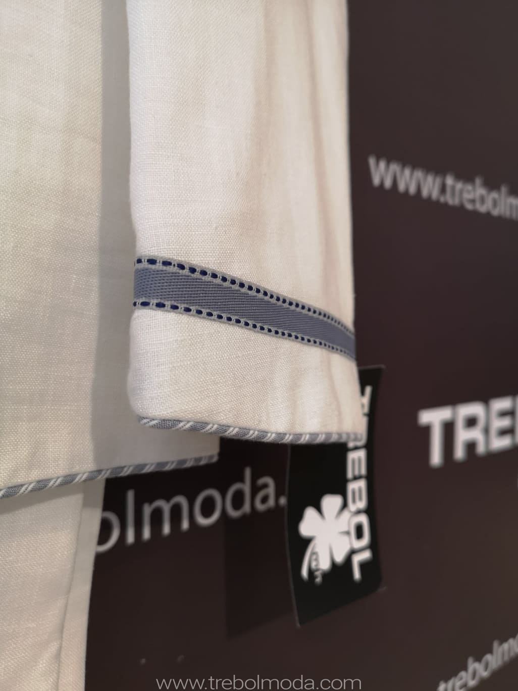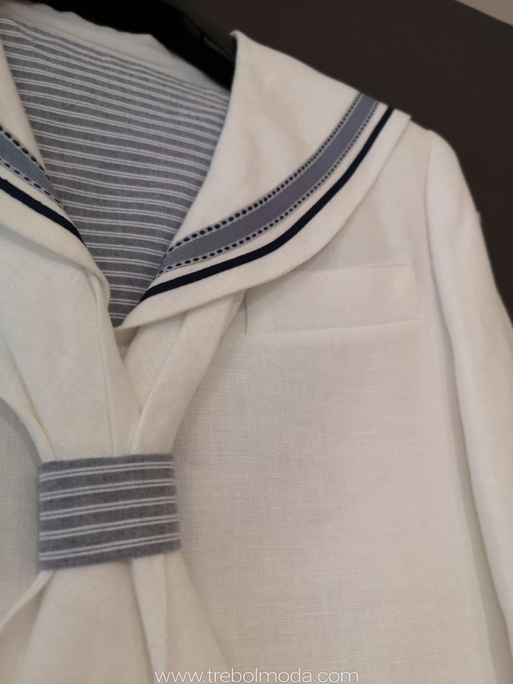 Casaca en color blanco con baberola con cenefas azul celeste compañeras a puños. Confeccionada en lino (100%)