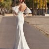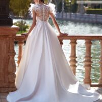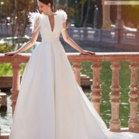 El cuerpo con escote en pico profundo aporta un aire sensual y refinado, mientras el mikado y el tul bordado se funden en una propuesta que equilibra dramatismo y elegancia.